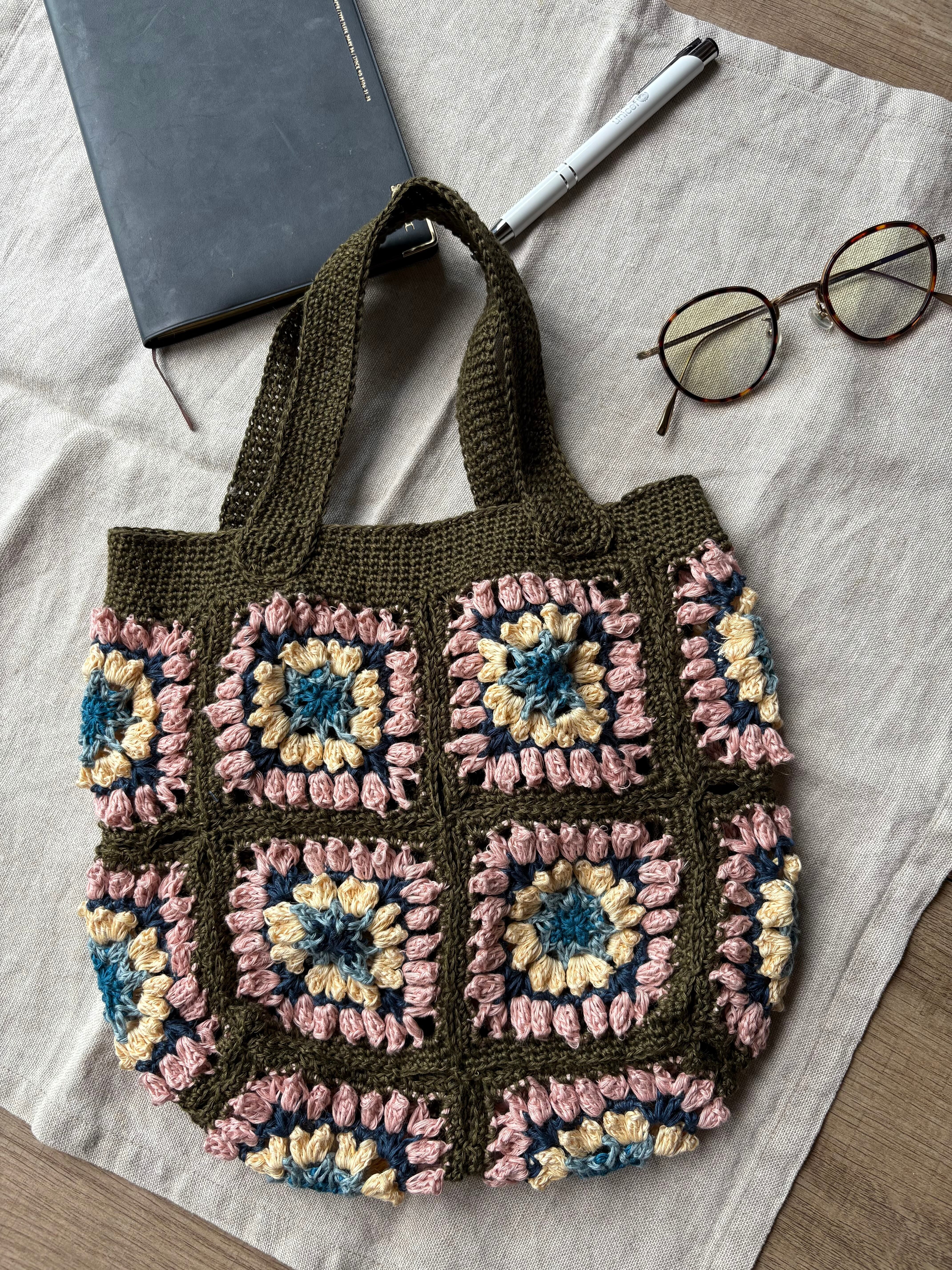 「マーガレットバッグ モスグリーン」は、深いモスグリーンとスモーキーピンクの色合いが魅力の、デイリーユースに最適なバッグです。シンプルなデザインながら、どこか温かみを感じさせる優しい雰囲気を持っています。